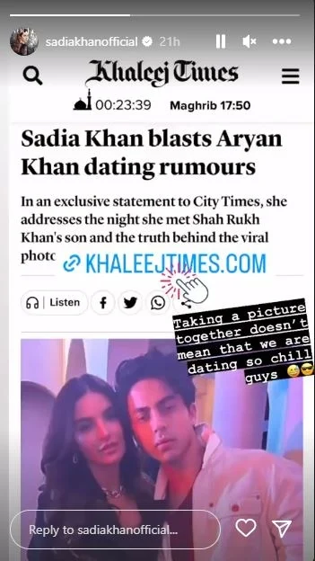 Sadia Khan shares post over ‘fake news’ she’s dating Aryan Khan. Sadia Khan, who was recently seen in a photo with actor Shah Rukh Khan‘s son Aryan Khan,