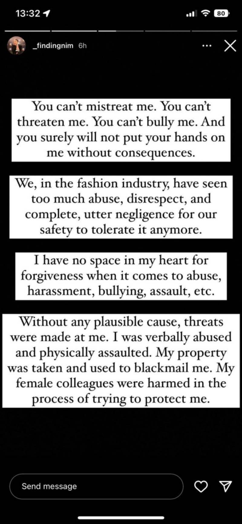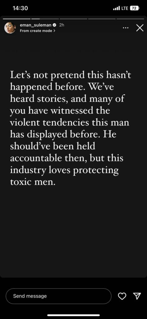 Model Eman Suleman added, “Let’s not pretend that this hasn’t happened before. We’ve heard stories, and many of you have witnessed the violent tendencies this man has displayed in the past. He should have been held accountable earlier, but this industry tends to protect toxic men.”