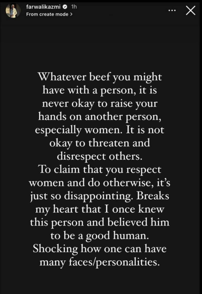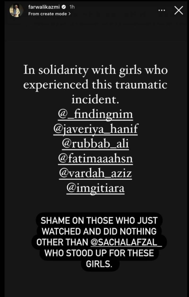 Joining the support for Jacob, prominent model Farwa Ali Kazmi called for accountability and a thorough investigation into the matter. “I stand in solidarity with the girls who endured this traumatic incident,” Kazmi wrote. “Shame on those who merely watched without taking action, except for Sachal Afzal, who stood up for these girls. It is never acceptable to resort to physical violence against another person, especially women. Threatening and disrespecting others is utterly wrong. It is disheartening when individuals claim to respect women but act contrary to their words. It breaks my heart that I once knew this person and believed in their goodness. It is shocking how someone can have multiple faces and personalities.”