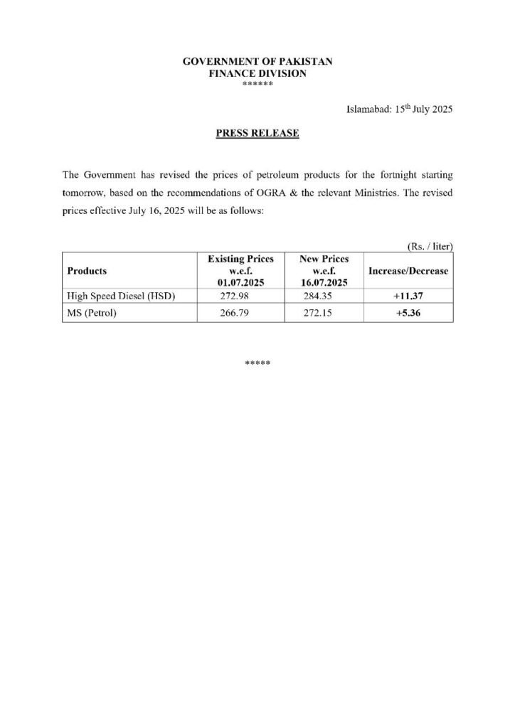 In a statement, the Finance Division said that the government has revised the prices of petroleum products based on the recommendations of Oil and Gas Regulatory Authority (Ogra) and the relevant ministries.