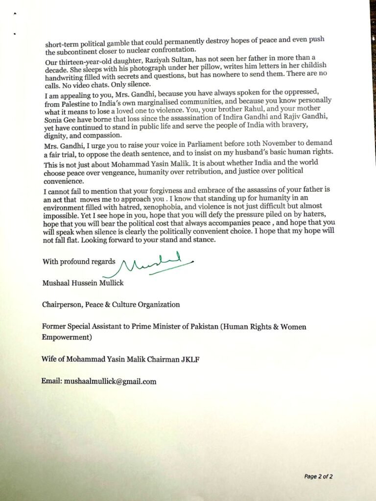 In her letter, Mullick reminded Gandhi that Malik once played a key role in peace talks between Pakistan and India. “He laid down arms for dialogue, embraced Ahimsa, and became a bridge between peoples,” she wrote. “Seven Indian Prime Ministers, including Atal Bihari Vajpayee, trusted him in peace-building efforts. To now brand him a terrorist and hang him is hypocrisy that threatens to bury reconciliation.”
