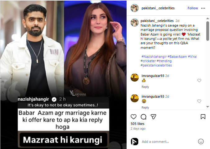 Nazish Jahangir Goes Viral for Witty Reply About Babar Azam. Famous Pakistani actress Nazish Jahangir has recently grabbed attention on social media with her witty response to a fan’s question about Pakistan cricket player Babar Azam.