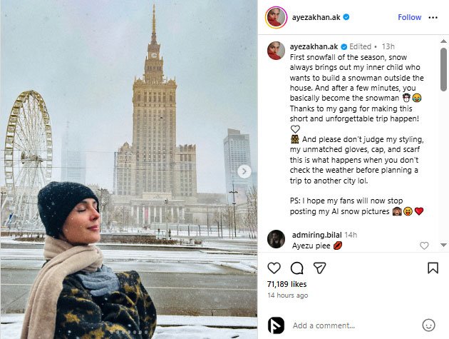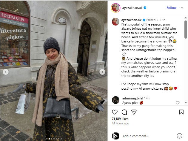 Actress addressed her fans’ obsession with her AI snow pictures in a good way, adding, “PS: I hope my fans stop posting my AI snow pictures now.”