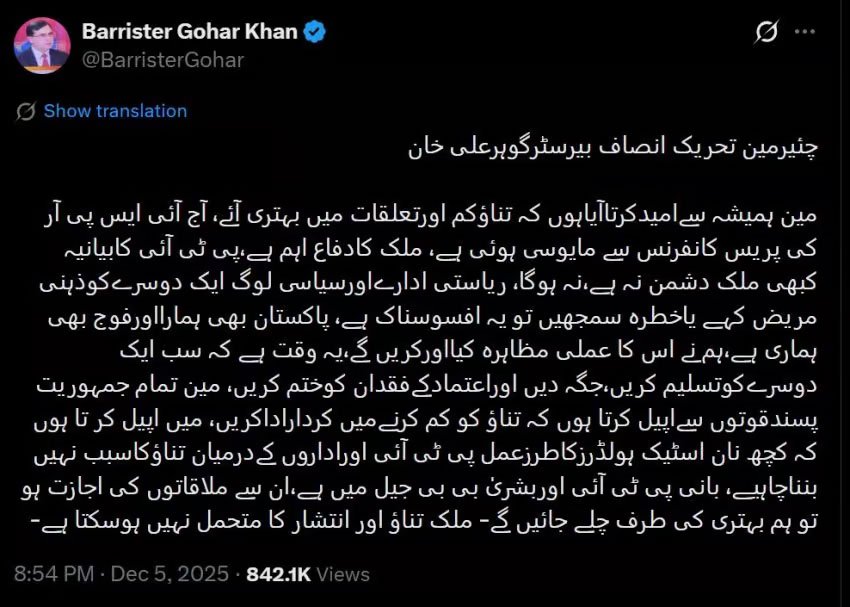 Barrister Gohar said that Pakistan is also ours, the army is also ours, it is time for everyone to recognize and give space to each other, end the lack of trust. The country cannot afford tension and chaos.