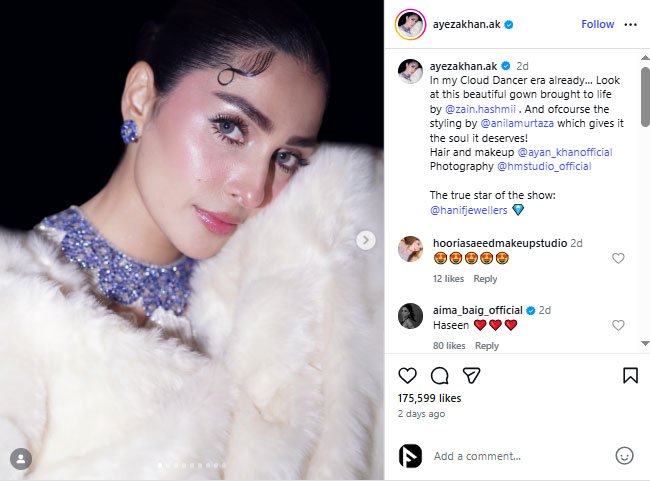 Fans and celebrities quickly filled the comments section with admiration, praising her graceful style and glowing presence. Just a day earlier, Ayeza had also captured attention by sharing glamorous photos and videos from an event in Lahore.