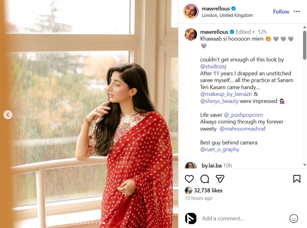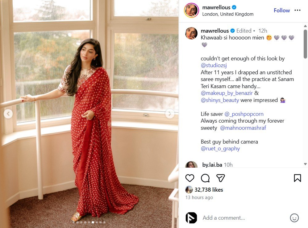 In the pictures, she is dressed in a deep red saree, and she explained in her caption that she had draped the saree herself for the first time in eleven years. She added a soft and poetic line, saying “Khawaab si hooon mien.” She also said that the practice she did years ago during the filming of Sanam Teri Kasam helped her remember how to drape it.