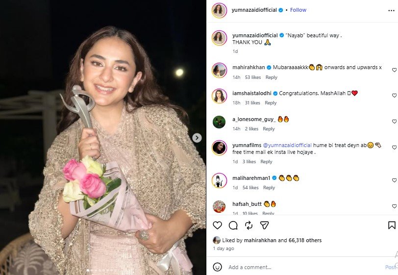 The night became even more special for Yumna as she won her first-ever film award. She received the Best Film Actress of the Year award for her debut film Nayab at the 24th Lux Style Awards. This win marked her seventh consecutive Lux Style Award, a rare achievement that highlights her consistency and talent.