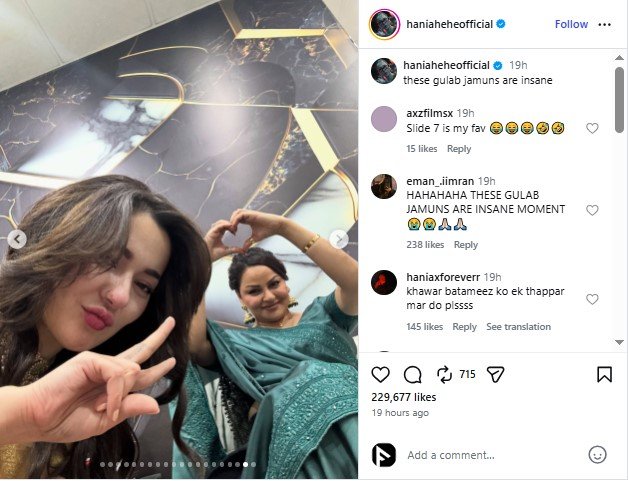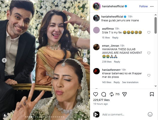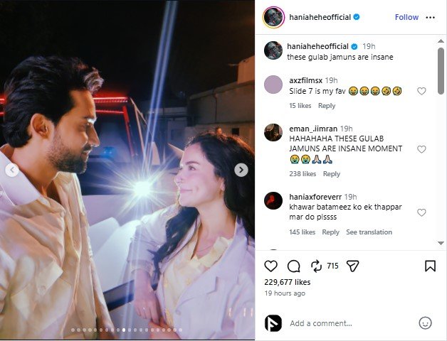 Pakistani Actress Hania Aamir recently gave her fans a fun behind-the-scenes look at her stage play Meri Zindagi Hai Tu. She shared several photos on Instagram from the set, jokingly captioning them These gulab jamuns are insane.