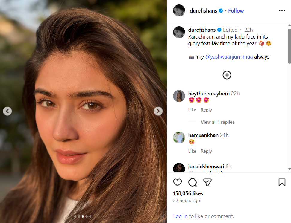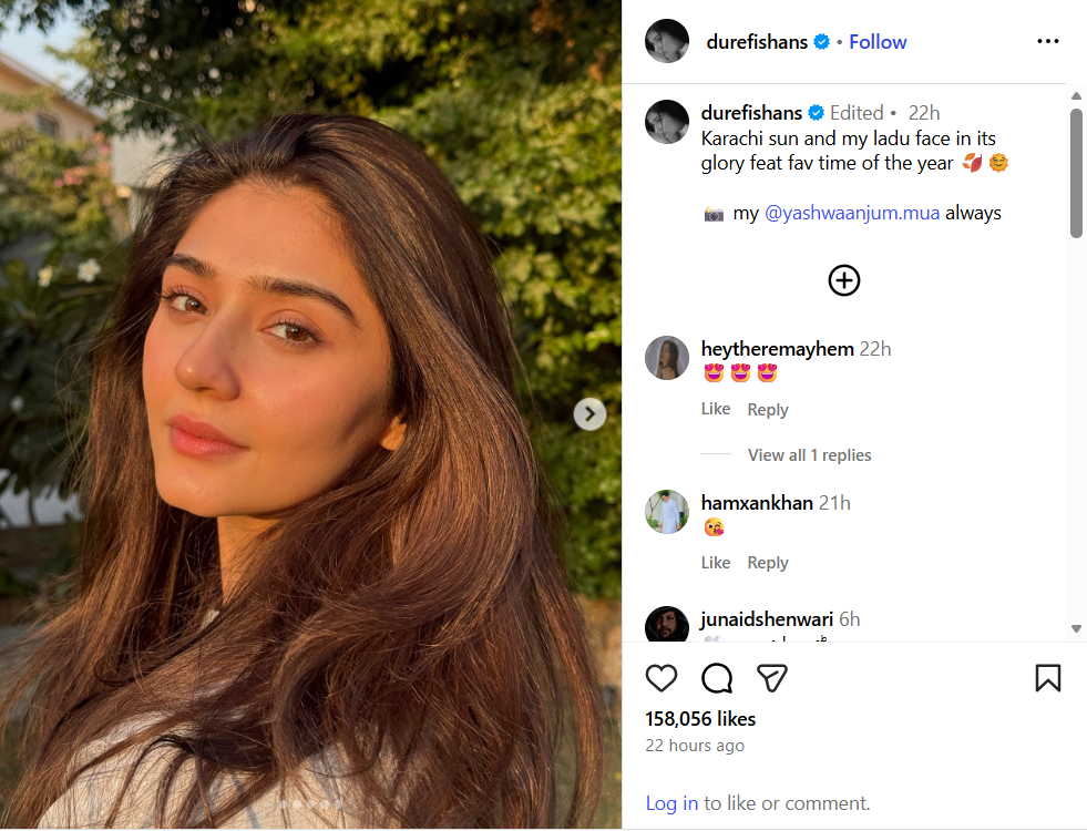 In her caption, Durefishan wrote that the Karachi sun and her “ladu face” were shining in her favorite season of the year. Her soft glam look and warm tones matched perfectly with the bright sunlight, giving her photos a gentle and charming feel that her fans love.