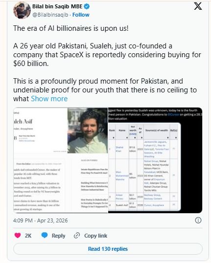 On Tuesday, April 22, 2026, Elon Musk’s SpaceX posted a quiet but bombshell announcement on X — it had secured the option to acquire Cursor, one of Silicon Valley’s hottest AI coding startups, for a staggering $60 billion later this year. If the acquisition doesn’t close, SpaceX will still pay $10 billion for the joint work completed during their partnership. At the center of this story is a 26-year-old from Karachi — Sualeh Asif, one of Cursor’s four co-founders, who went from competing in the International Math Olympiad for Pakistan to becoming a billionaire at one of the world’s most valuable private companies.